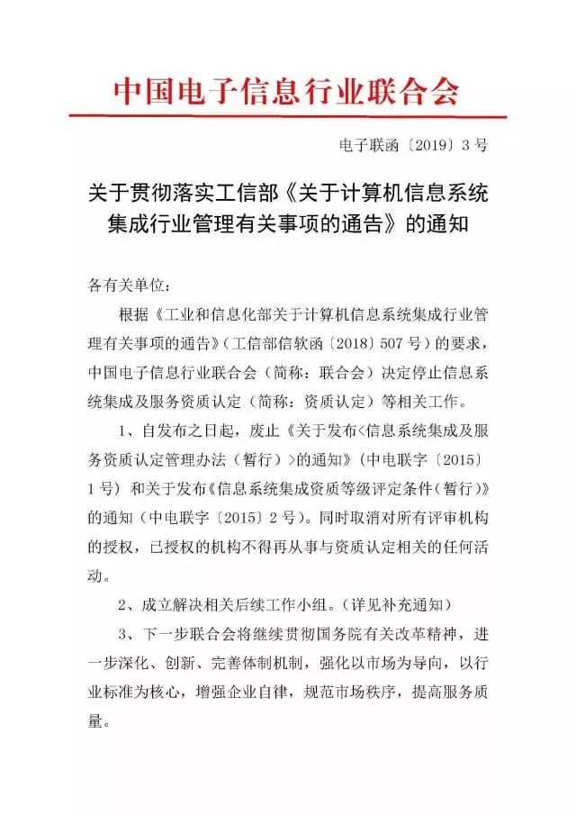 近日,中国电子信息行业联合会发布《关于贯彻落实工信部<关于计算机信息系统集成行业管理有关事项的通告>的通知》,通知表明,中电联决定停止信息系统集成及服务认定等相关工作。